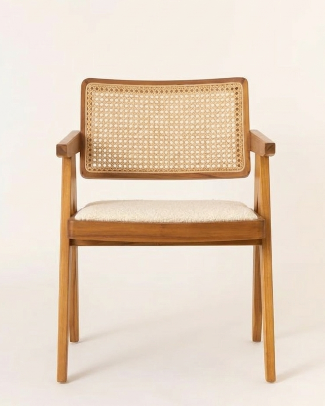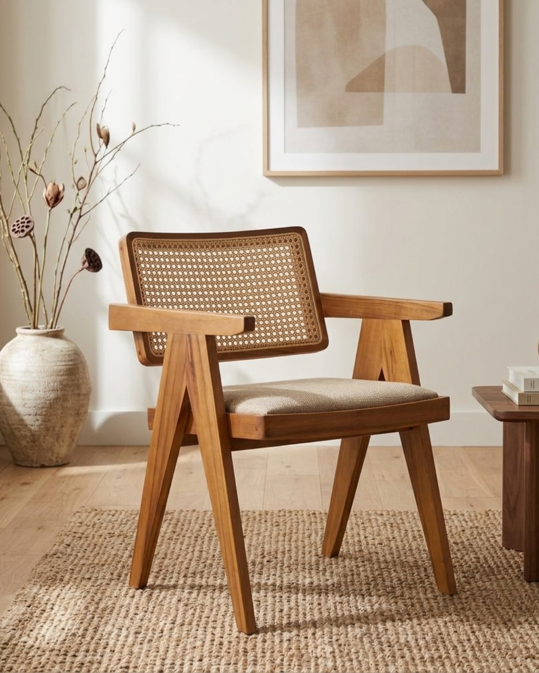 This beautifully crafted natural wood chair blends classic craftsmanship with modern design. The elegant cane-woven backrest provides natural ventilation while adding a timeless handcrafted aesthetic to the piece.