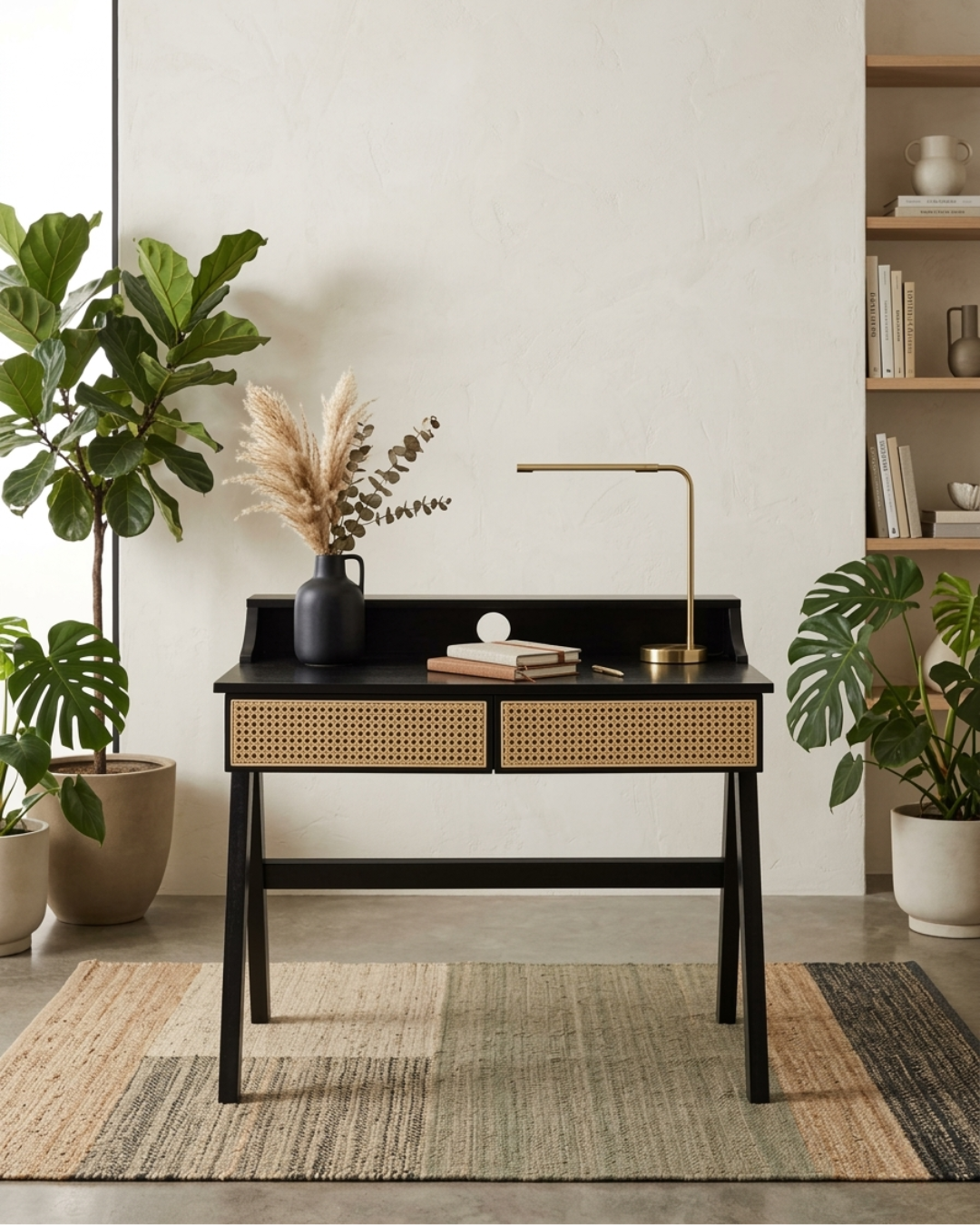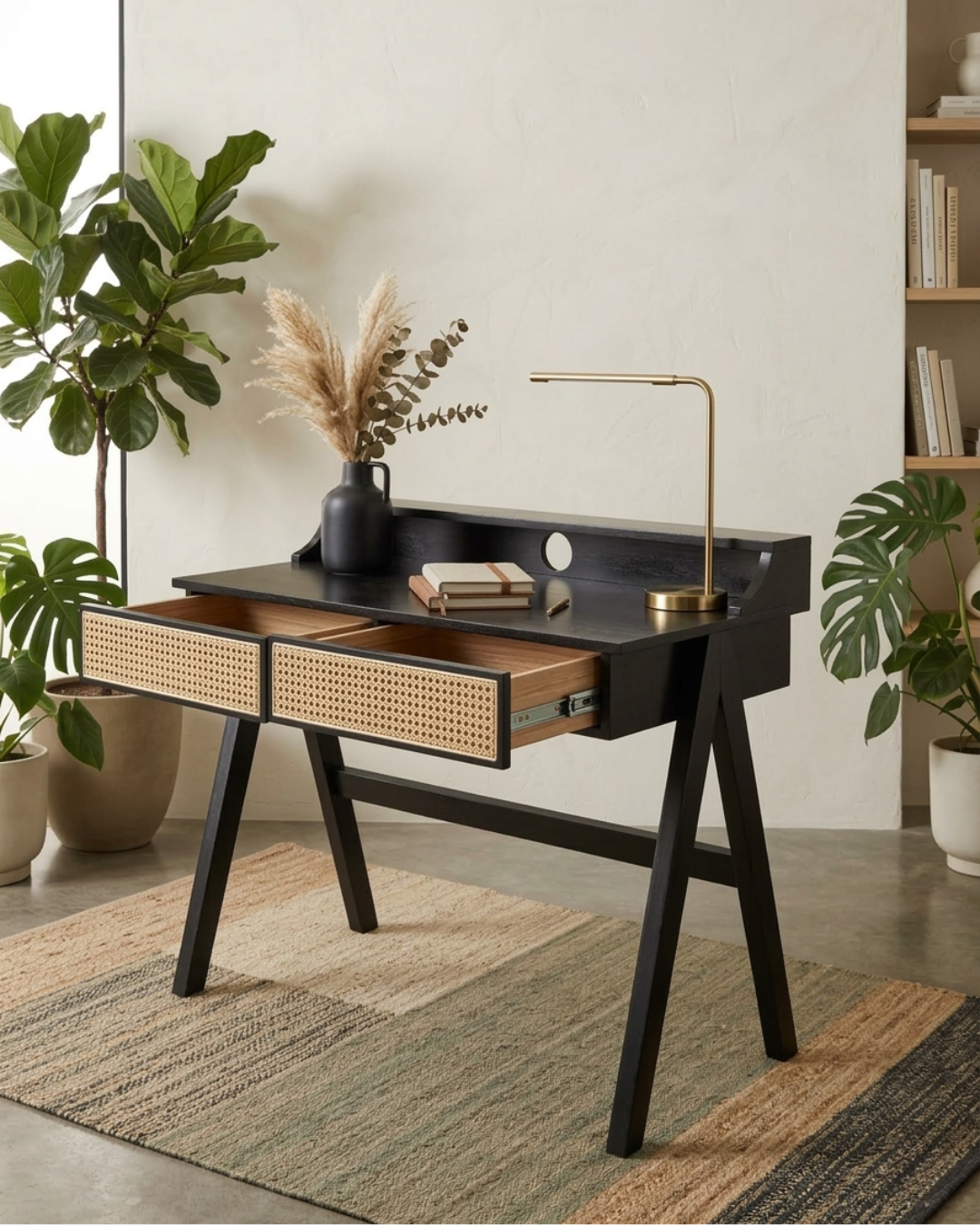This beautifully designed natural wood study table combines modern minimalism with handcrafted detailing. The highlight of the piece is its woven cane drawer fronts, which add texture and character while maintaining a sophisticated and contemporary aesthetic.